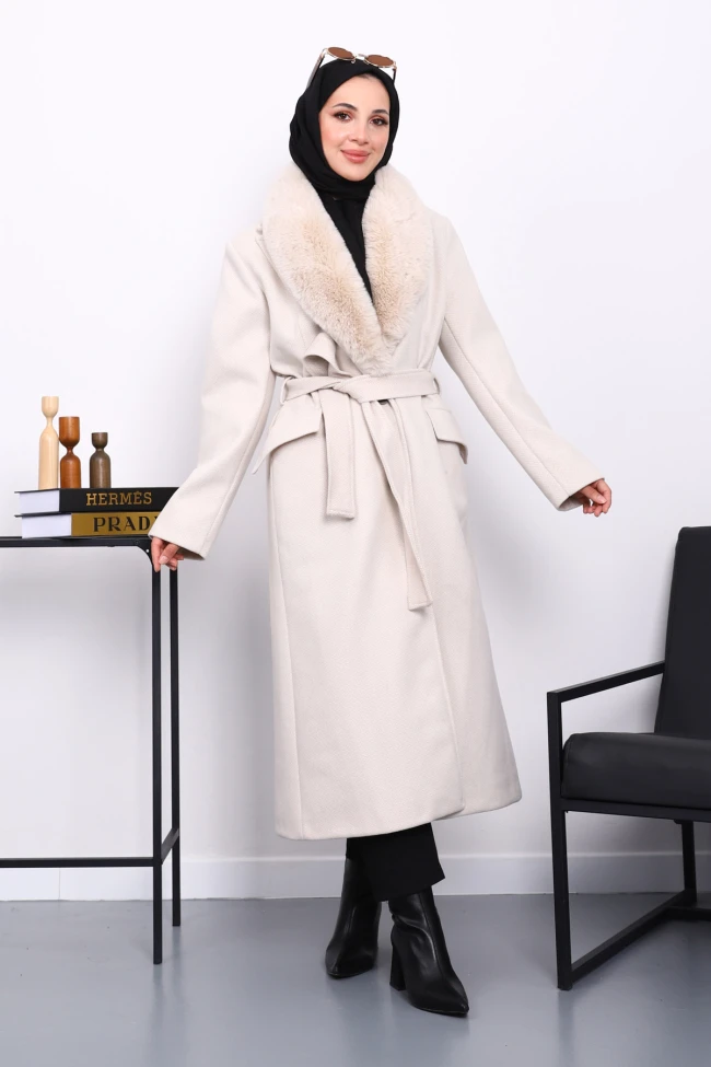 Camel Yaka Kürklü Kuşaklı Kaşe Kaban Gri Yaka Kürklü Kuşaklı Kaşe Kaban