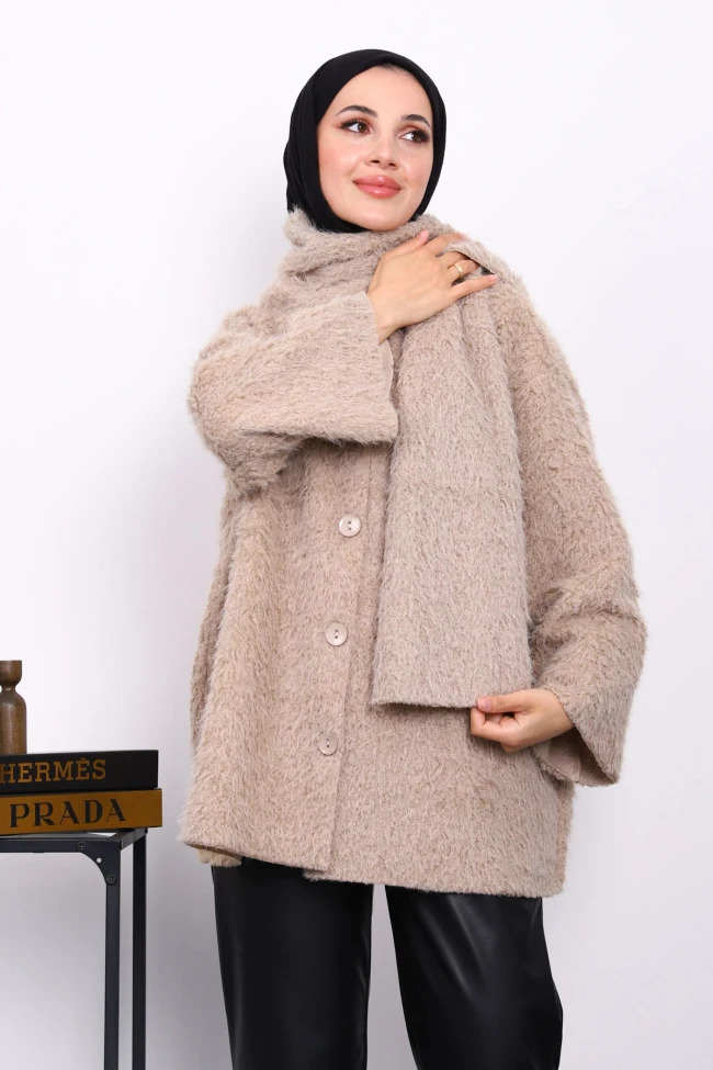 Kahverengi Atkılı Detaylı Düğmeli Angora Ceket Krem Atkılı Detaylı Düğmeli Angora Ceket