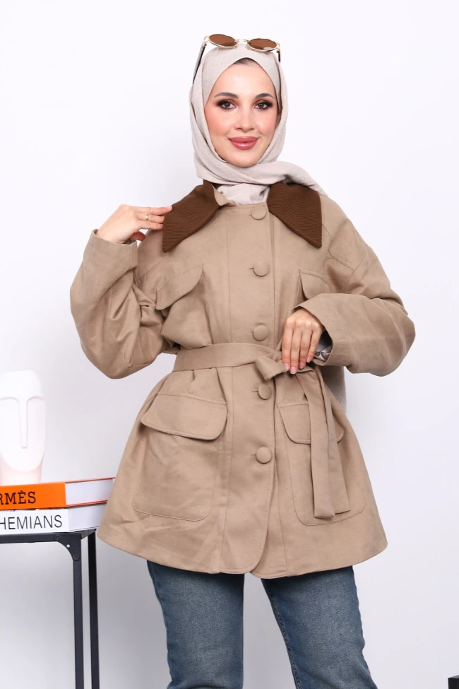 Kahverengi Yaka Garnili Cepli  Kuşaklı Trençkot Taba Yaka Garnili Cepli  Kuşaklı Trençkot Haki Yaka Garnili Cepli  Kuşaklı Trençkot