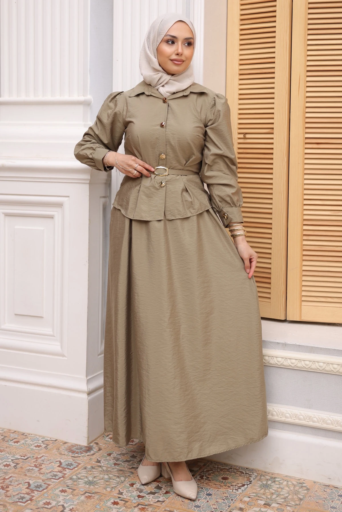 Vizon Kemerli Düğmeli Gömlek Etekli Takım Lacivert Kemerli Düğmeli Gömlek Etekli Takım Siyah Kemerli Düğmeli Gömlek Etekli Takım Kahverengi Kemerli Düğmeli Gömlek Etekli Takım Bordo Kemerli Düğmeli Gömlek Etekli Takım