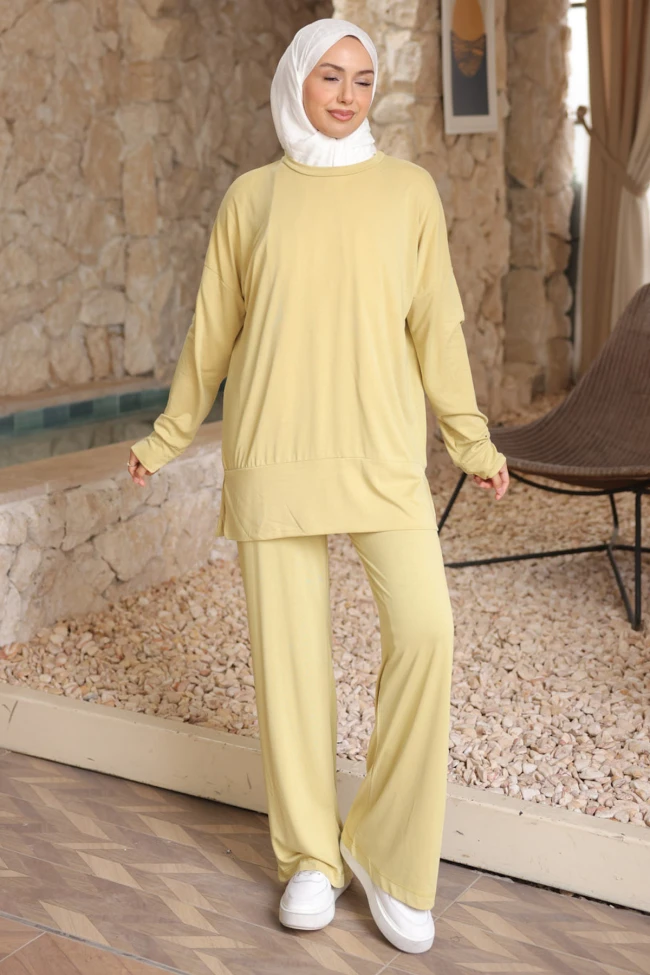 * Ürün Detay : Takım, hem konforu hem de modern muhafazakar çizgiyi bir araya getiren oldukça şık ve çabasız bir parça.Üst parçanın düşük omuzlu ve geniş kesimi, alt parçanın ise bol paça formunda olması hem vücut hatlarını belli etmiyor hem de gün boyu hareket özgürlüğü sunuyor.Pantolon yüksek bel bel lastikli ve cepli.