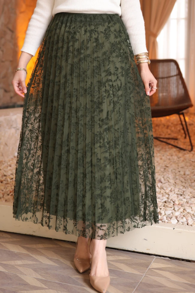 * Ürün Detay : Etek, hem dokusu hem de rengiyle oldukça zarif ve romantik bir hava taşıyor.Etek, tül üzerine işlenmiş floral desenlerden oluşuyor. Altındaki astar, tülün transparanlığını dengelerken desenlerin daha belirgin görünmesini sağlamış.İnce pileli yapısı, eteğe hareket kazandırıyor. Bu tarz pileler, kişiyi olduğundan daha uzun ve ince gösterme avantajına sahiptir.