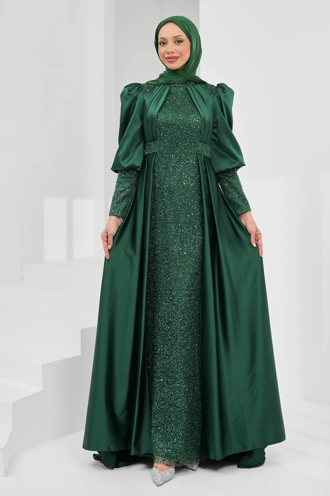 * Ürün Detay : Abiyemiz, özellikle özel davetler ve ağır organizasyonlar için tasarlanmış, modest moda anlayışını yansıtan oldukça ihtişamlı bir parça.Elbisede iki farklı doku çok başarılı şekilde harmanlanmış. Gövde kısmında kullanılan yoğun payet işlemeli kumaş, elbiseye derinlik ve ışıltı katarken; yanlarda ve omuzlarda kullanılan saten kumaş, asil bir duruş sergiliyor.Belden aşağıya doğru süzülen saten paneller,pelerin havası yaratmış. Bu detay, yürürken hareket kabiliyeti sağlarken aynı zamanda silüeti daha uzun ve heybetli gösteriyor.Omuzlardaki hafif kabarık kesim, dik bir duruş sergilenmesine yardımcı oluyor. Kolların dirsek altından itibaren payetle devam etmesi, tasarımdaki bütünlüğü korumuş.Bel hattındaki payet detaylı kuşak formu, vücut hatlarını zarifçe ayırarak elbiseye form kazandırmış.